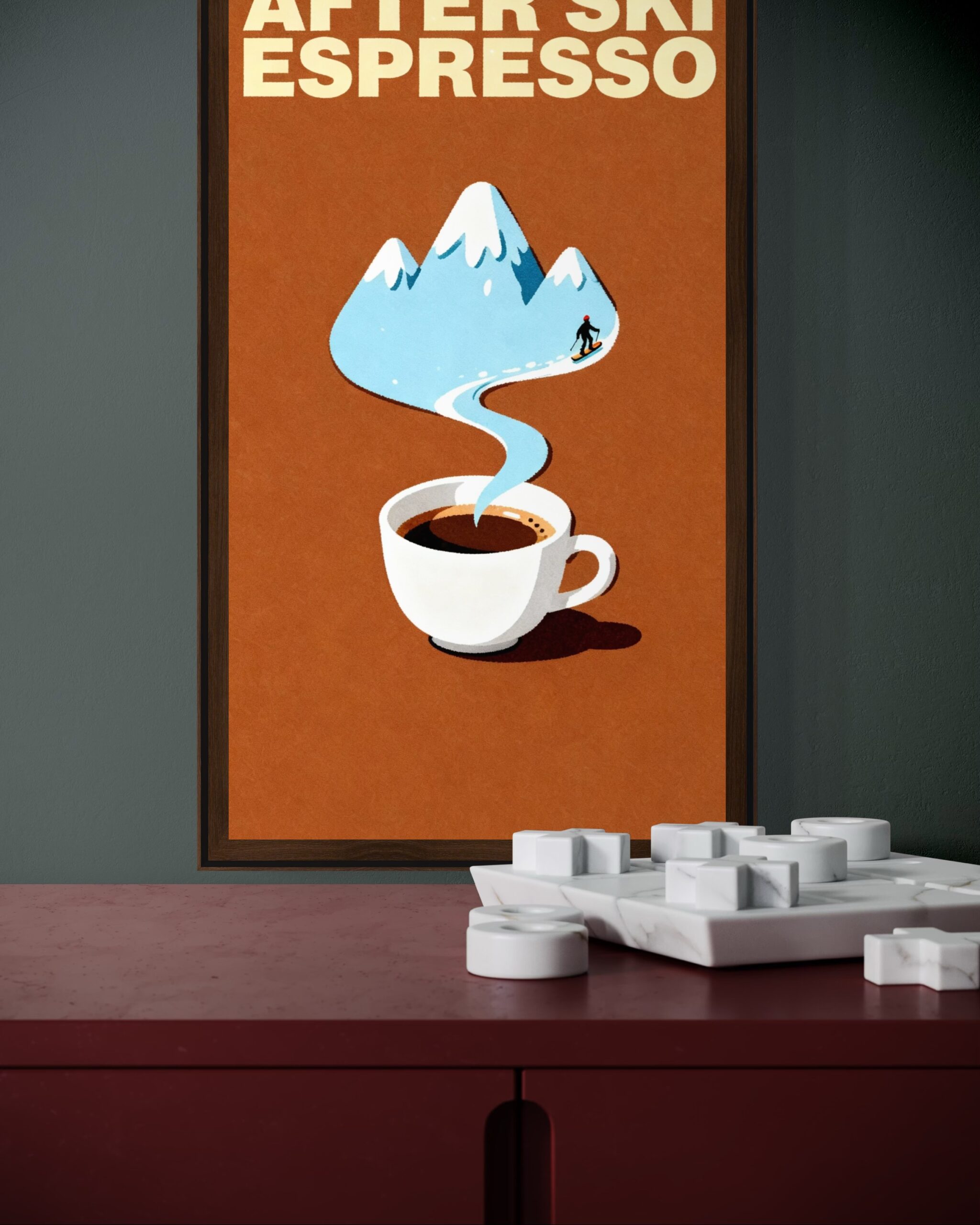 En poster för alla som älskar både kaffe och fjäll. Den vita espressokoppen står på en varm brun bakgrund, medan ångan formas till ett snötäckt berg med en liten skidåkare. Färgerna är rena och känslan är retro, som en klassisk affisch på en bergsstation. Perfekt till kök, caféhörna, fjällstuga eller kontor där du vill påminnas om både koffein och kalfjäll.