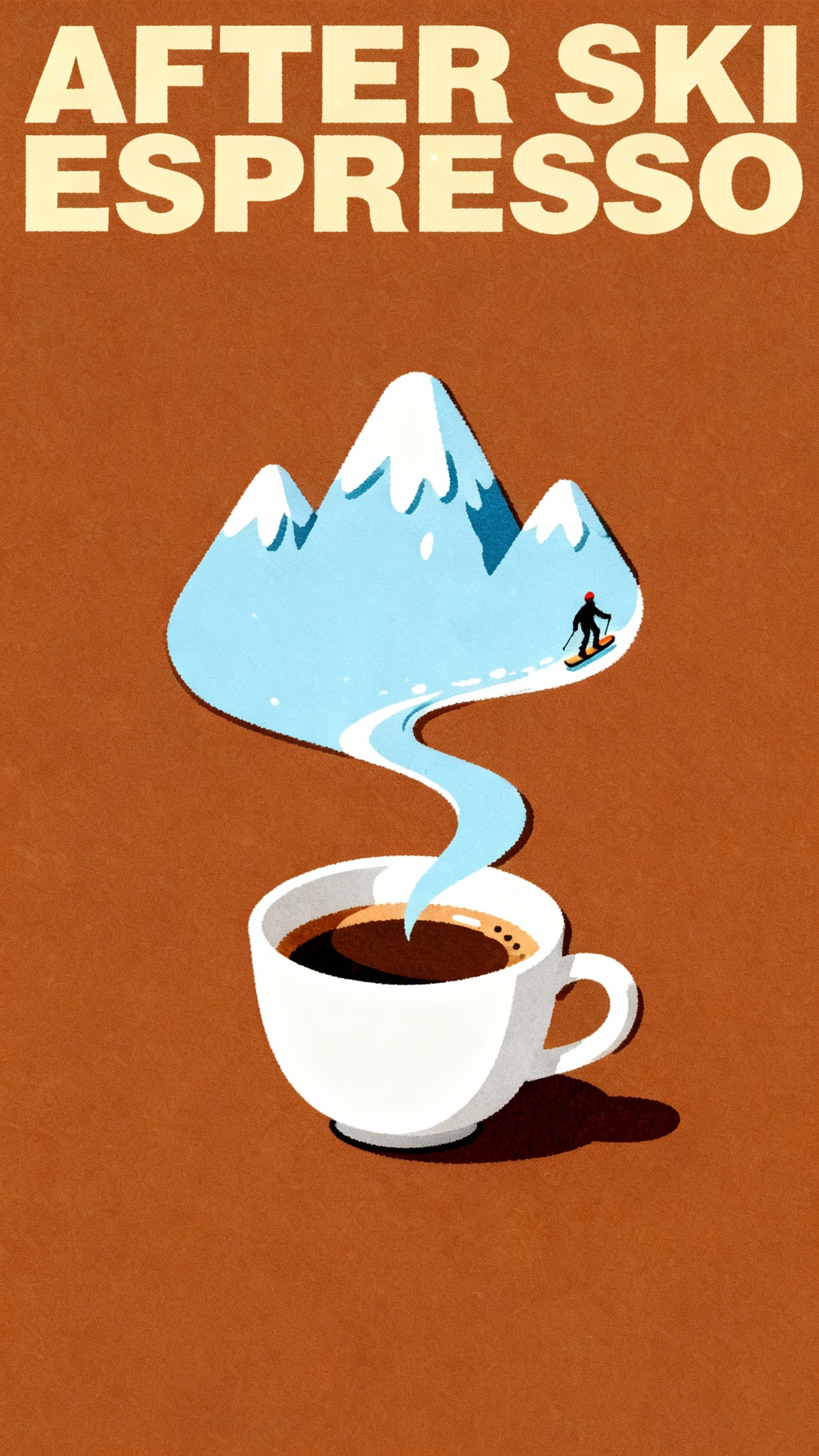 Grafisk illustration av en vit espressokopp på varm brun bakgrund där den blå ångan stiger upp och förvandlas till ett snötäckt berg med en liten skidåkare, retro posterstil, inga andra texter