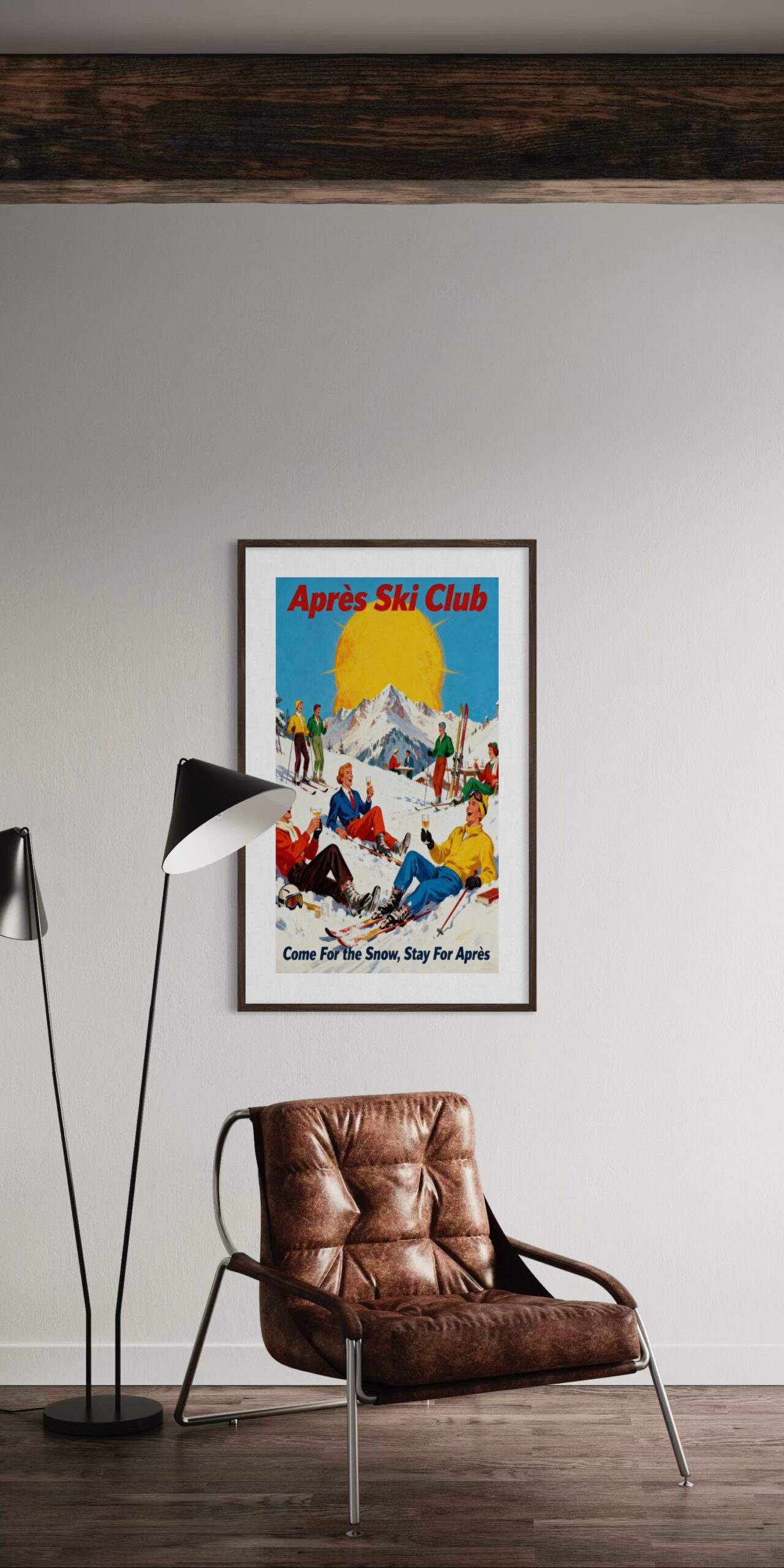 En klassisk après ski-poster i retrostil där solen alltid skiner och glasen alltid är halvfulla. Färggranna skidåkare sitter i snön framför ett soligt fjäll, med en stor gul sol och tydlig text. Motivet är perfekt i fjällstugan, hemmabaren eller vardagsrummet när du vill ha fjällvibb året runt.