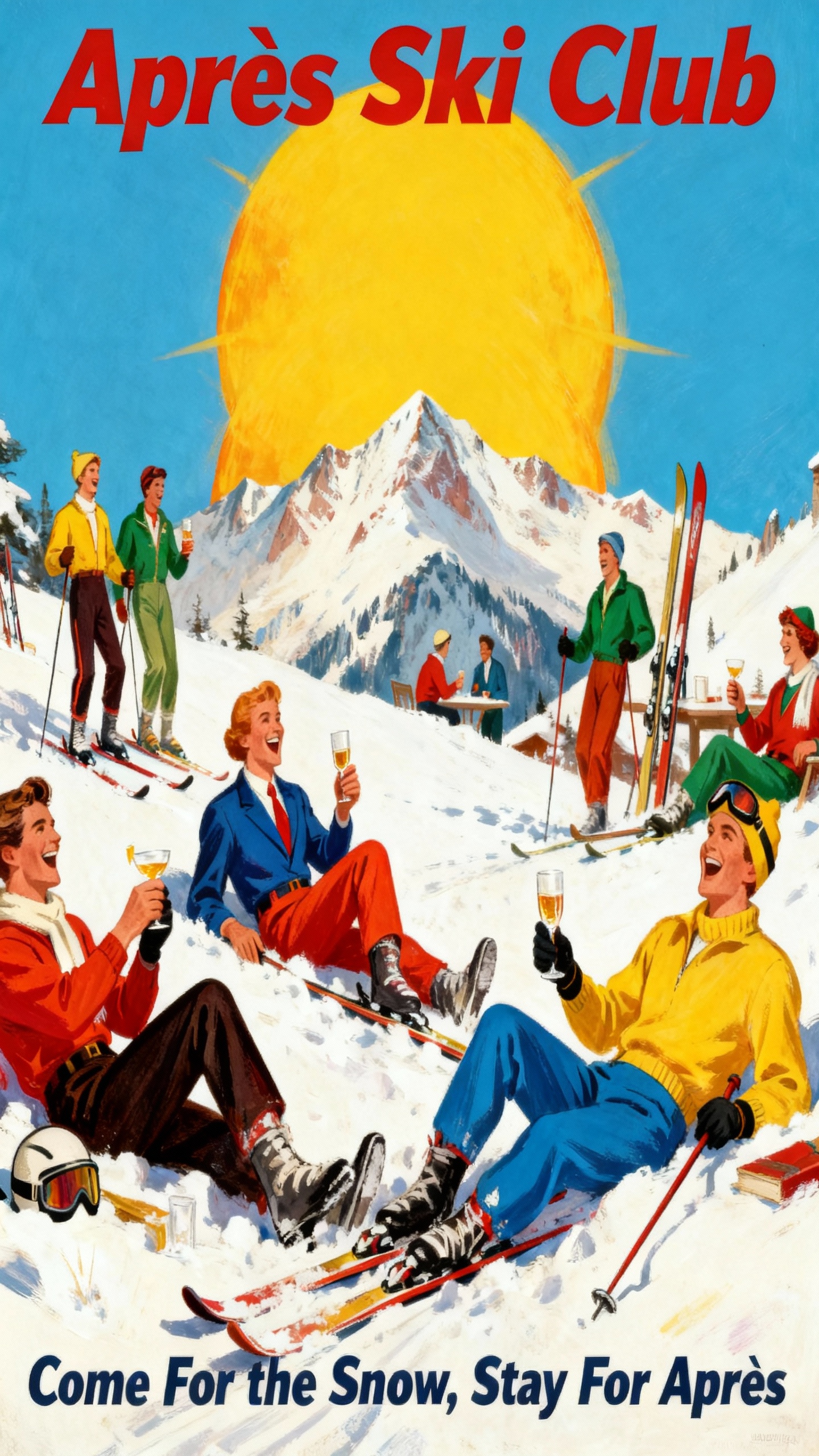 Retro skidposter med soligt fjäll, stor gul sol, färgglada skidåkare som sitter och skålar i snön, texten Apres Ski Club i toppen, grova penseldrag