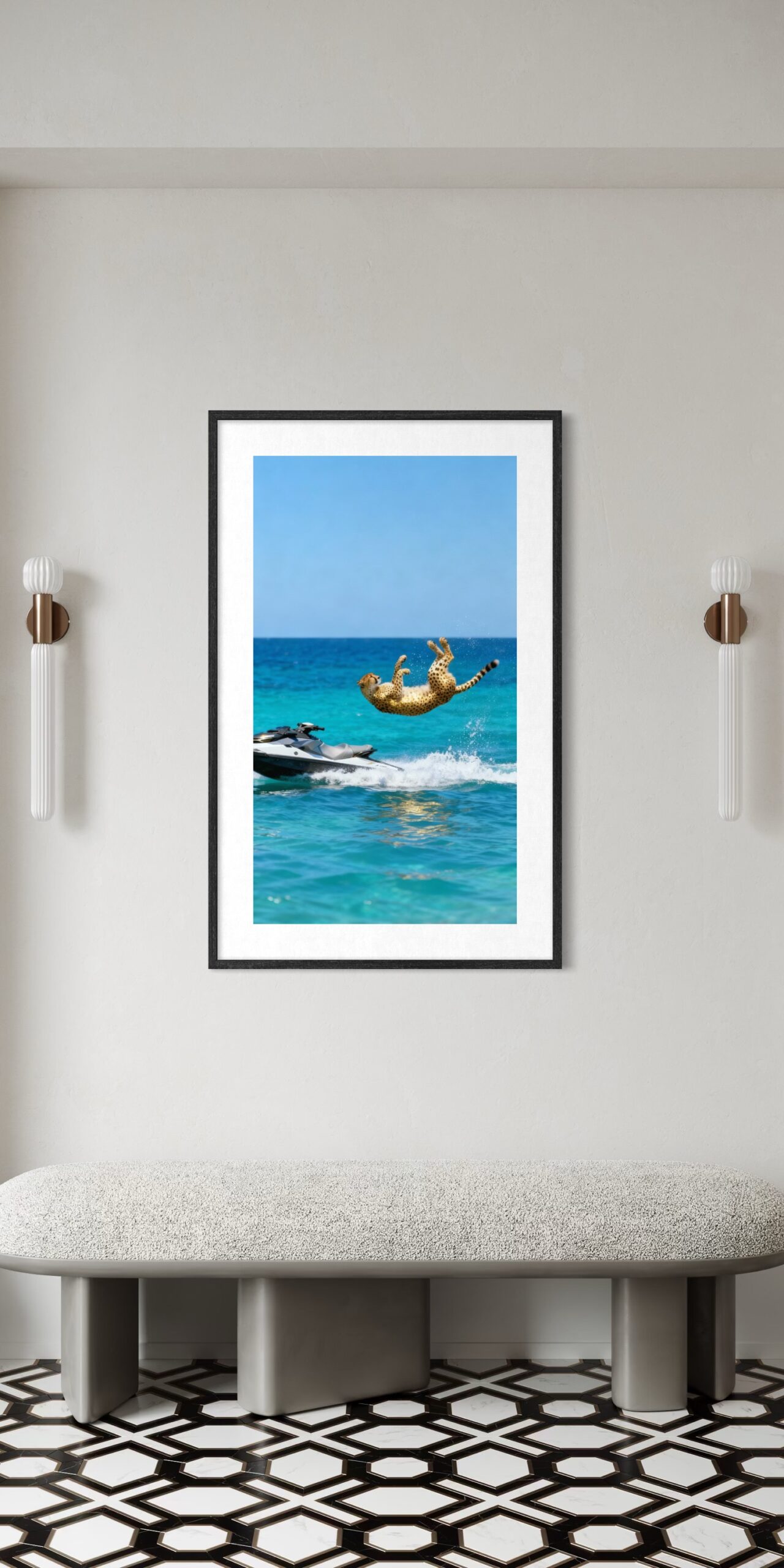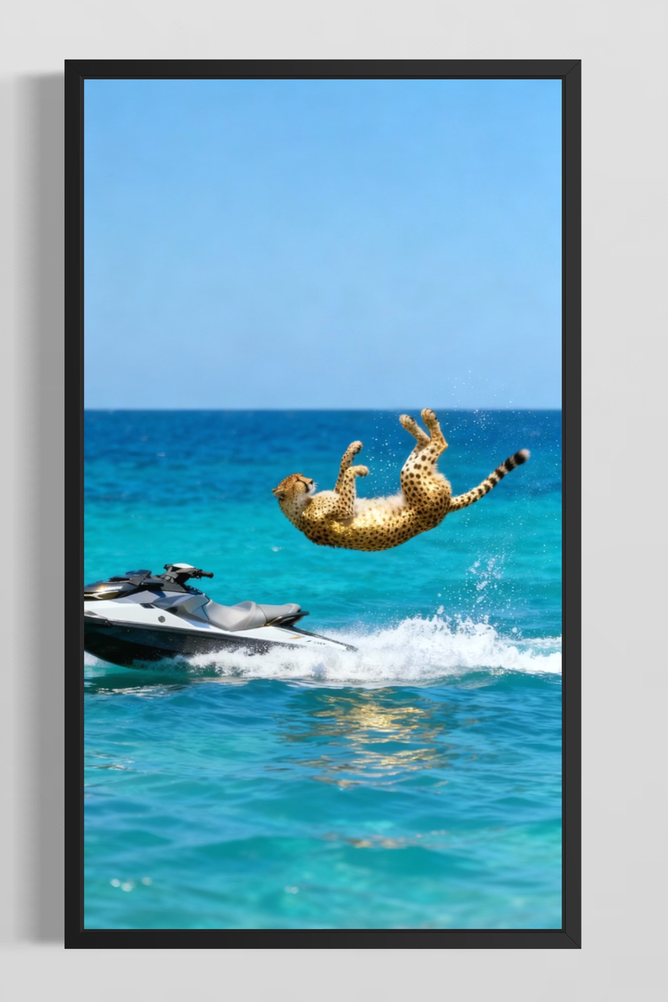 En maxad actionposter där världens snabbaste kattdjur tar semester på havet. Den fotorealistiska geparden flyger genom luften ovanför turkost vatten, med vattenskotern och sprayen kvar under sig. Solnedgångens varma ljus och rörelsen i motivet gör postern perfekt till gamingrum, tonårsrum eller som kaxig kontrast i vardagsrummet.