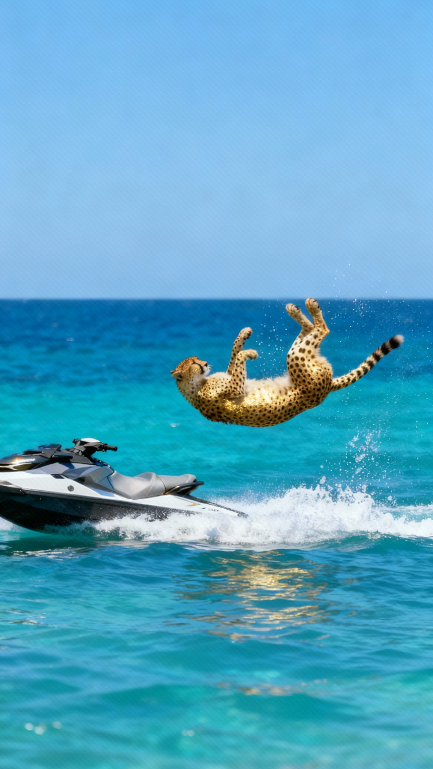 Fotorealistisk gepard som flyger bakåt i luften efter ett hopp med vattenskoter över turkost hav, stora vattenstänk, varm kvällssol, hög detalj och actionkänsla, ingen text