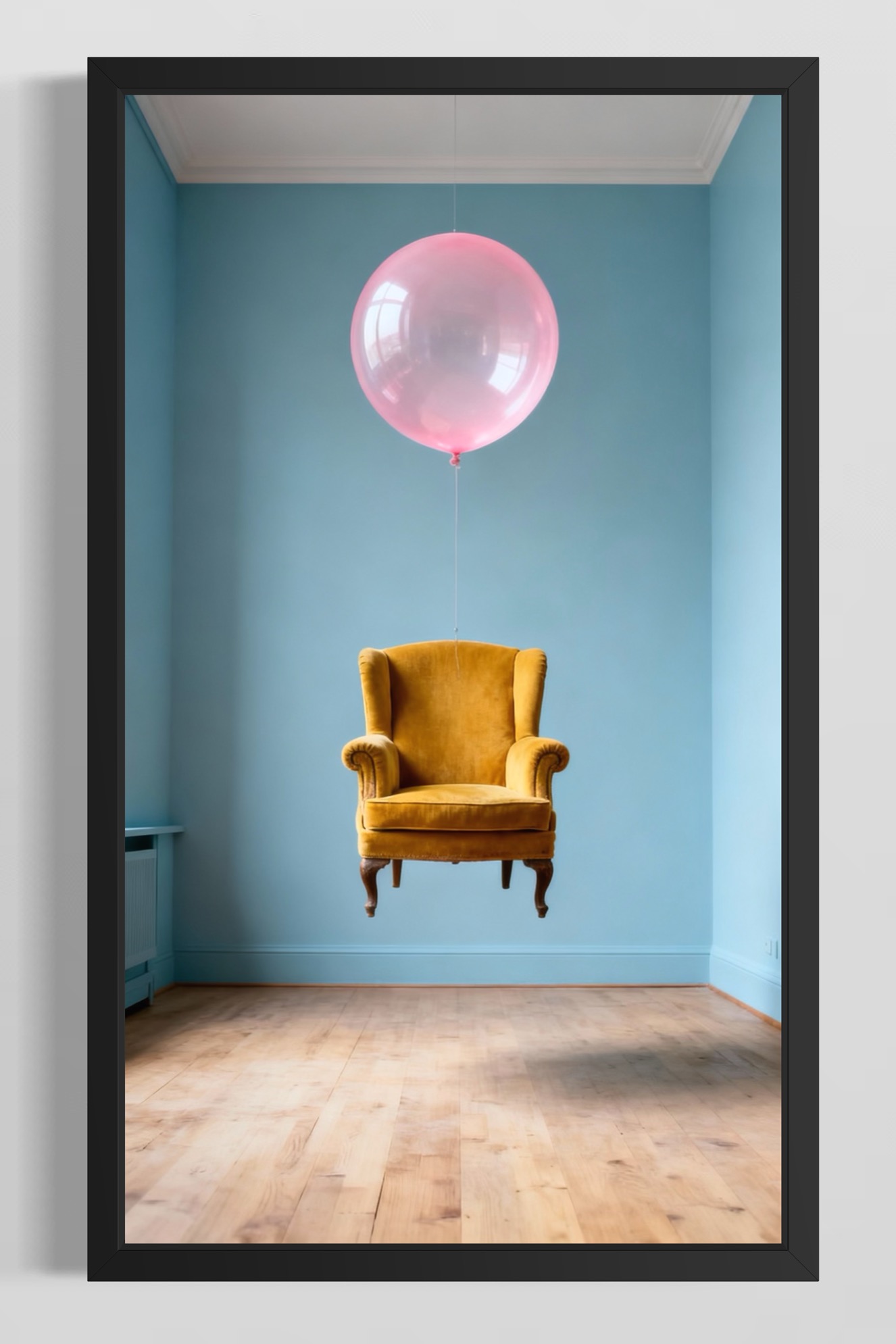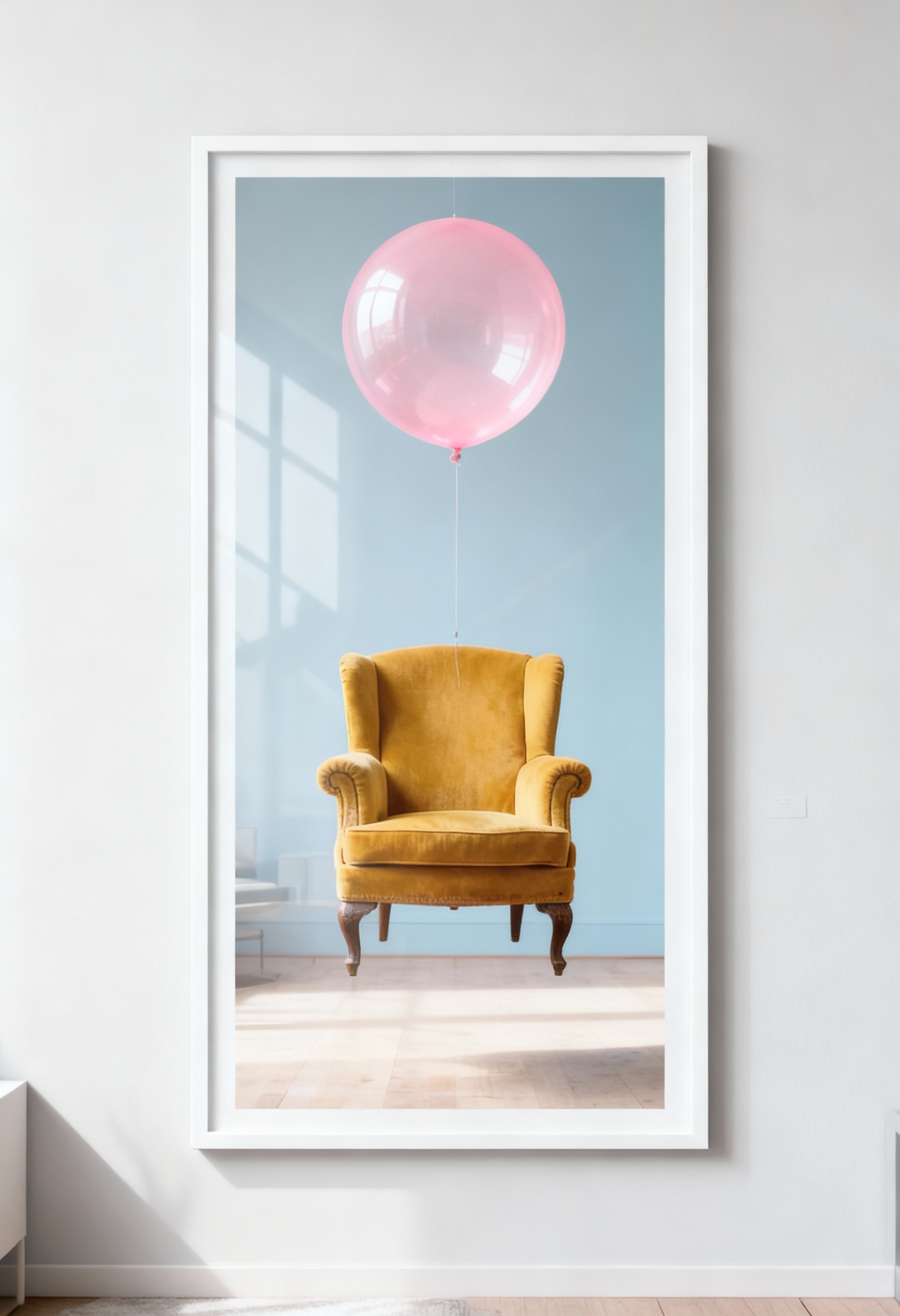 En drömsk inredningsposter där en klassisk fåtölj bokstavligen lyfter rummet. Den senapsgula stolen svävar ovanför golvet, upphängd i en enda rosa ballong, mot en dov blå vägg. Ett motiv som passar perfekt i vardagsrum, sovrum eller kontor där du vill addera lite mjuk surrealism utan att tappa den stilrena känslan.