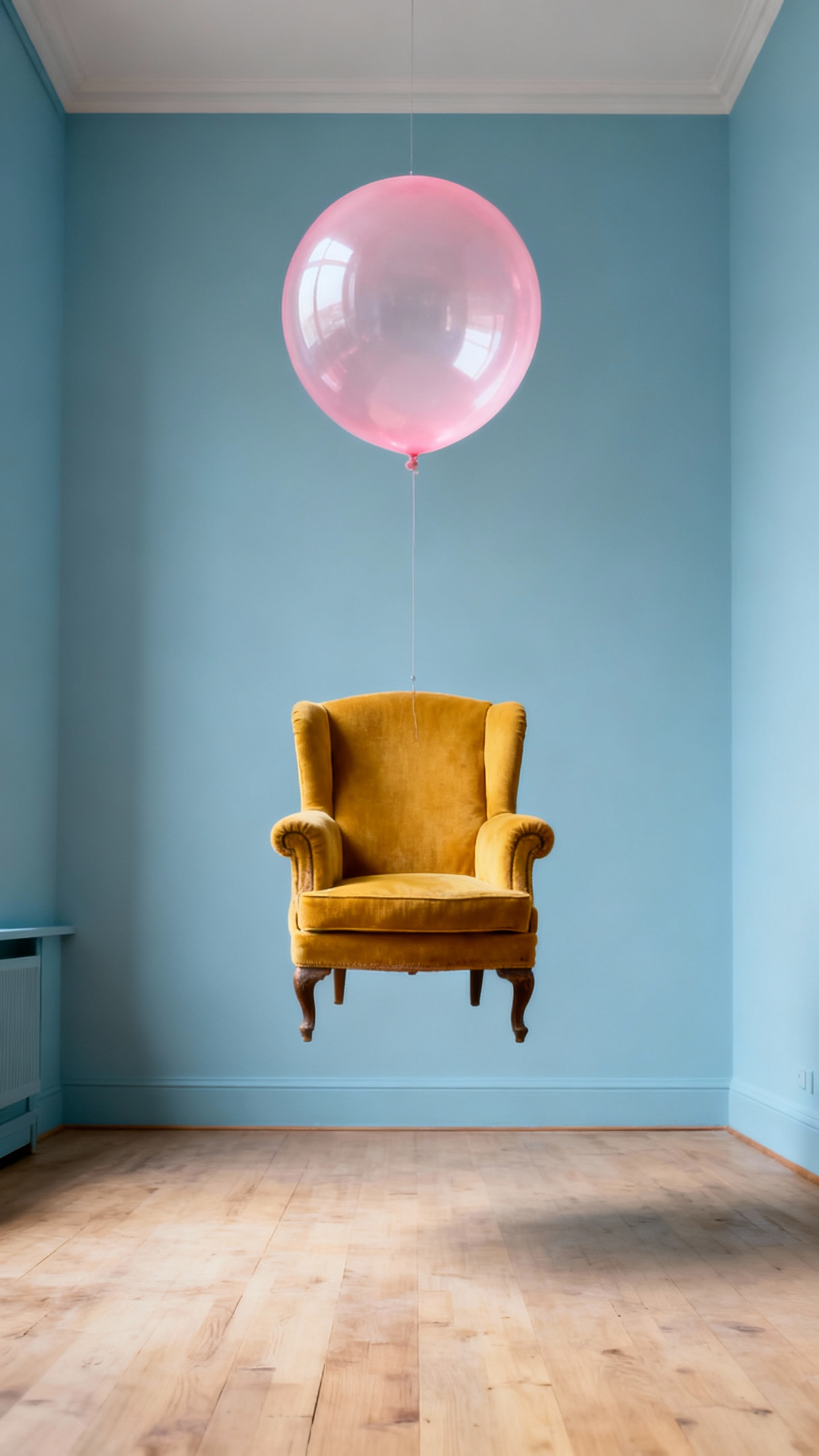 Fotorealistisk senapsgul fåtölj som svävar ovanför ett trägolv i ett blått rum, upphängd i en enda rosa ballong, mjukt naturligt ljus från sidan, ingen text