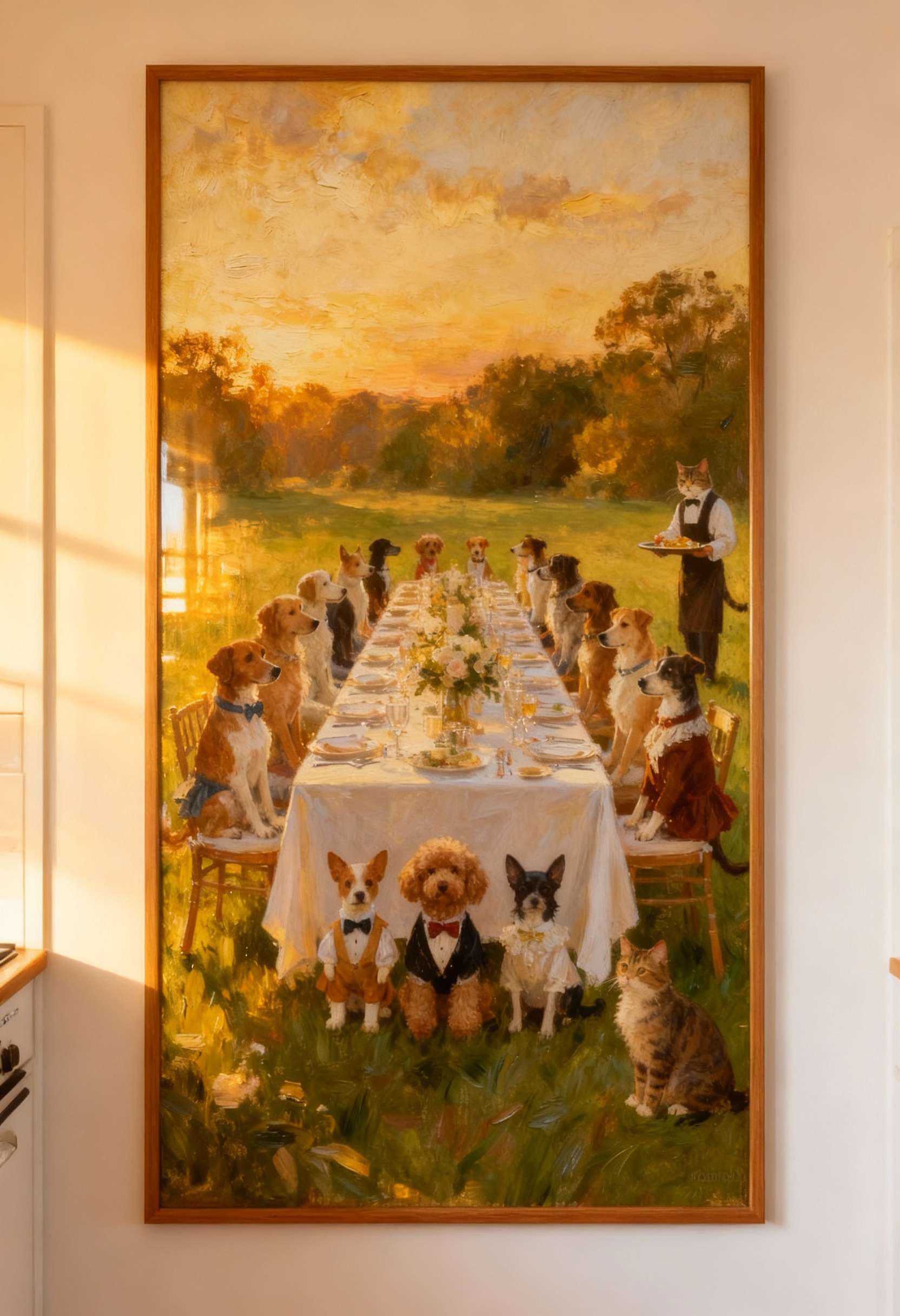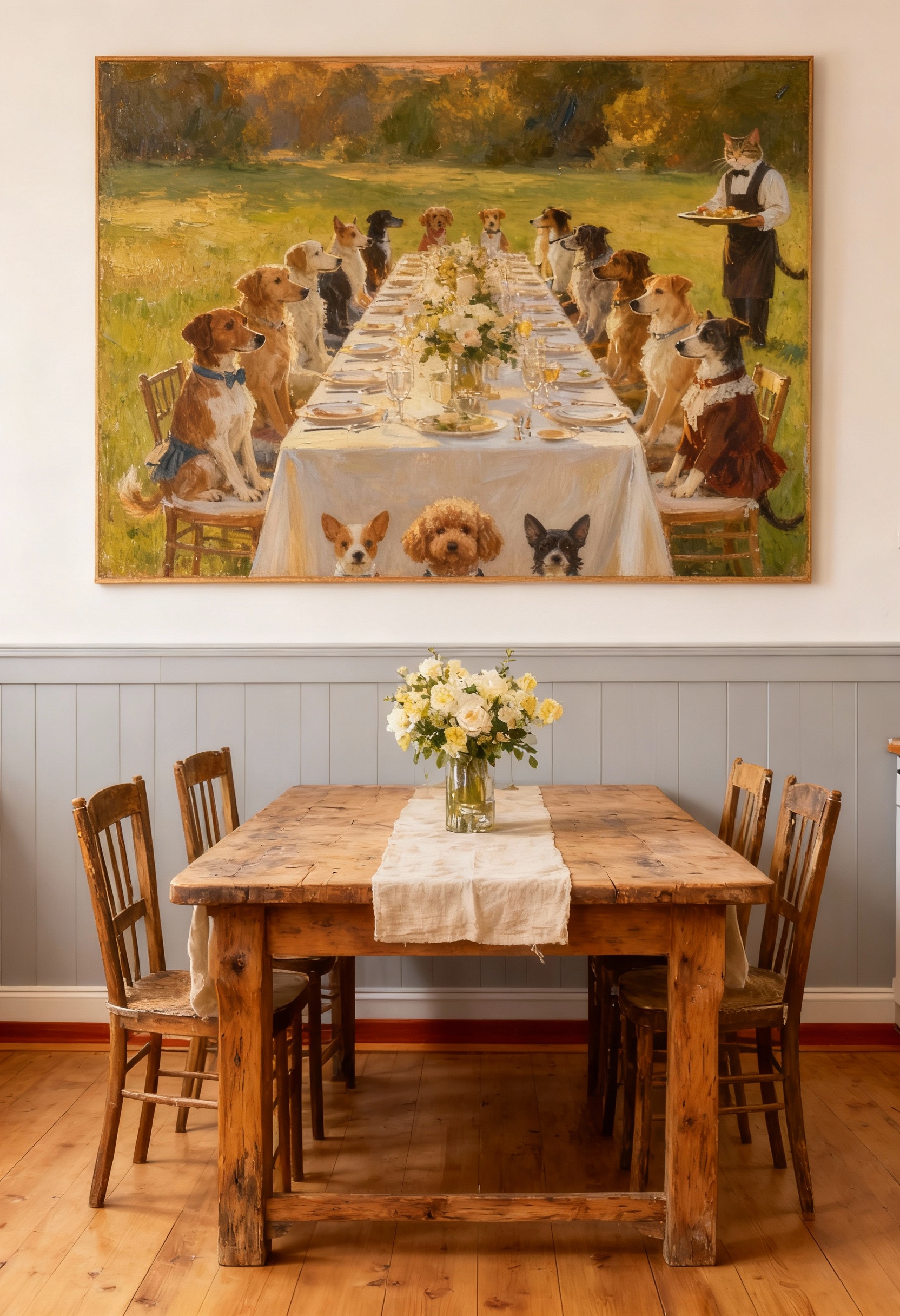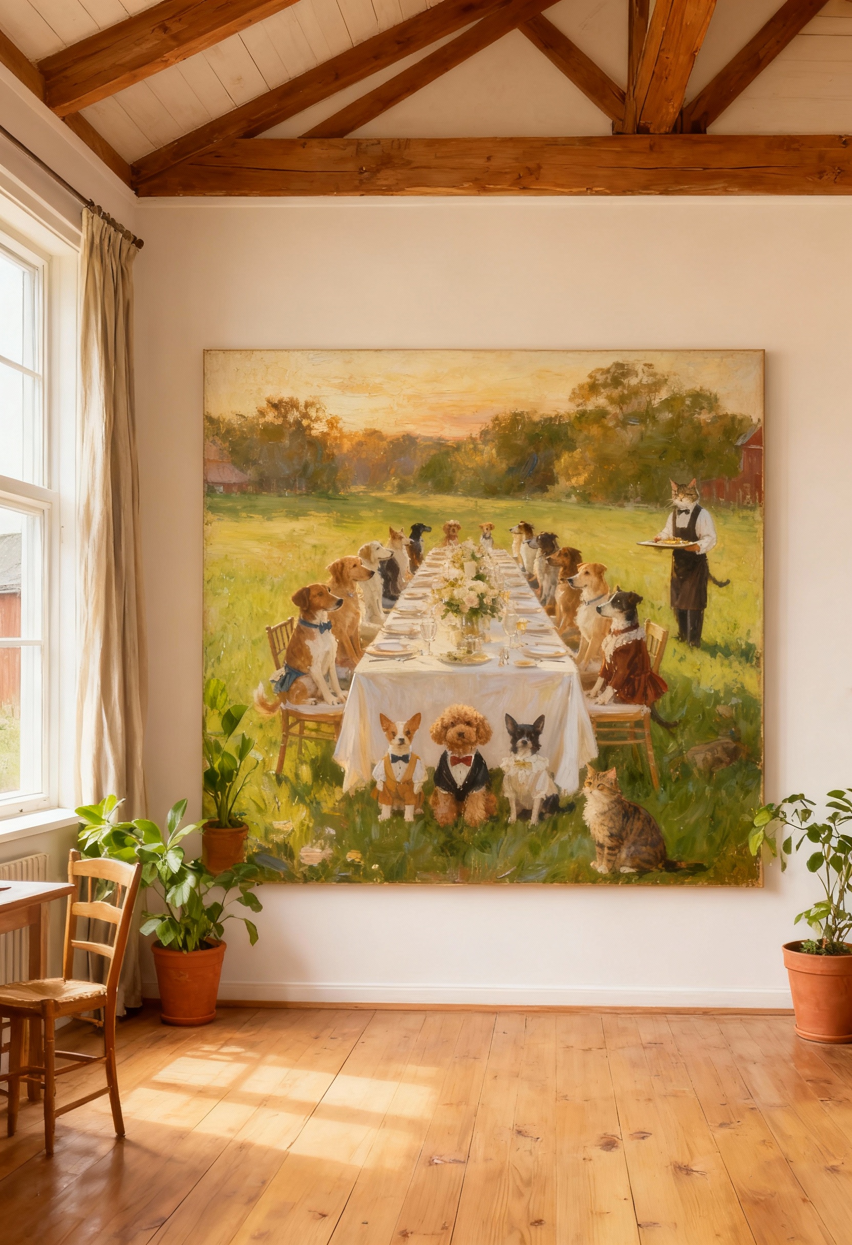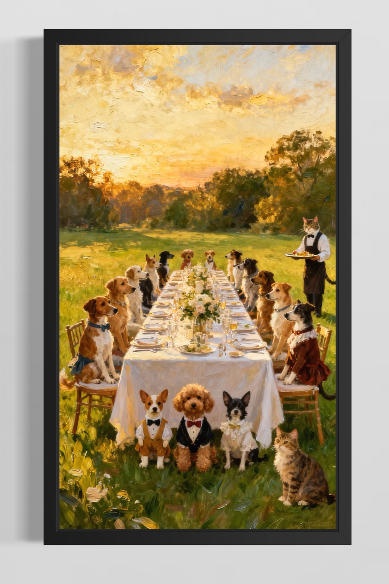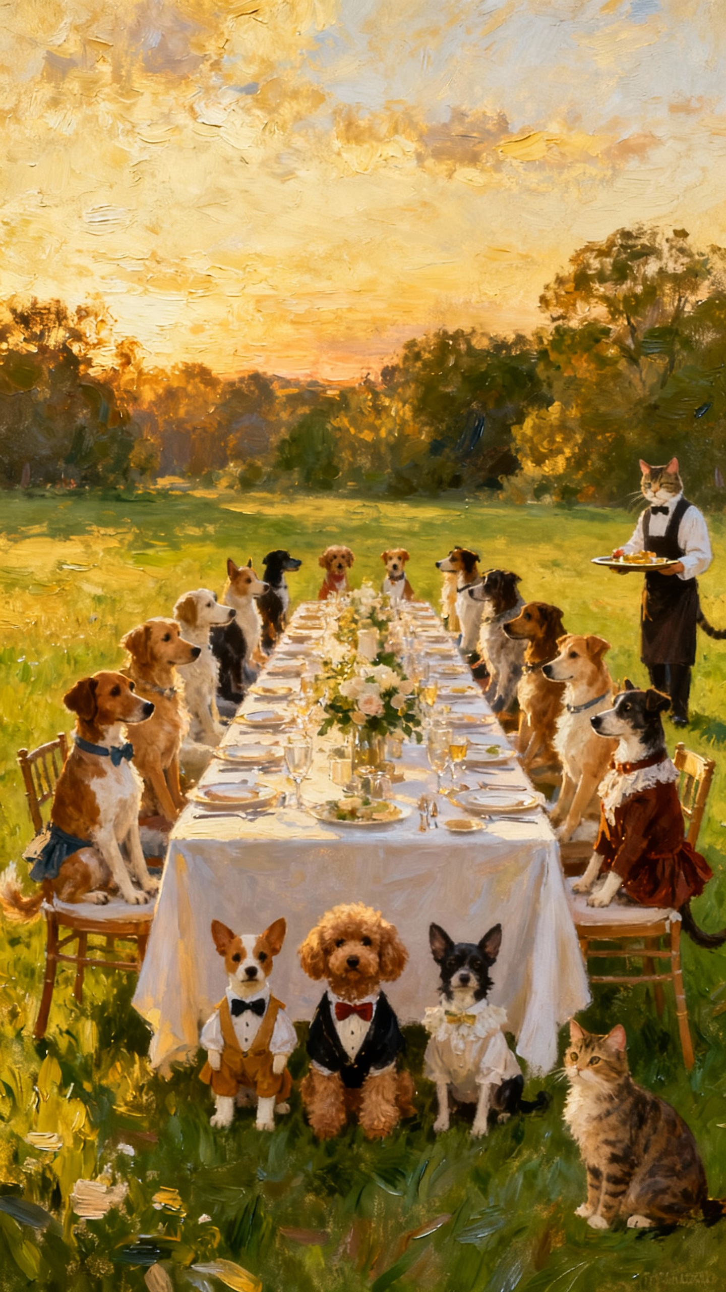 En charmig impressionistisk oljemålning av en elegant trädgårdsmiddag där hundar är gästerna och en katt serverar. De uppklädda hundarna sitter runt ett vackert dukat bord i gyllene kvällsljus. Målningen andas värme och humor – perfekt för djurälskare som uppskattar klassisk konststil.