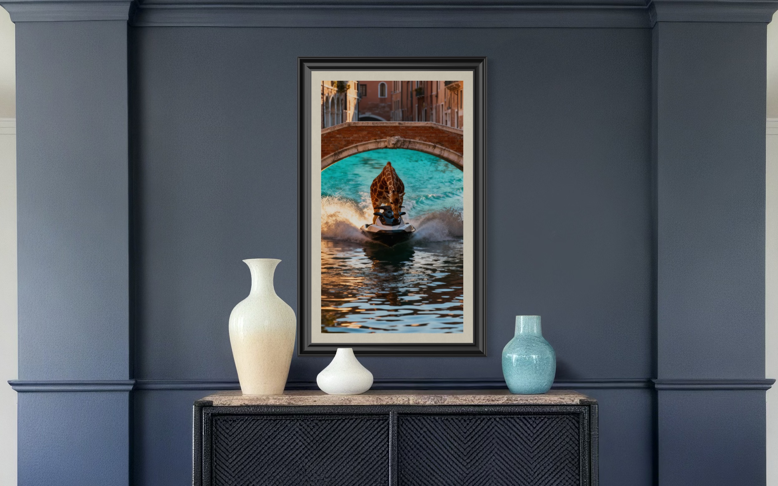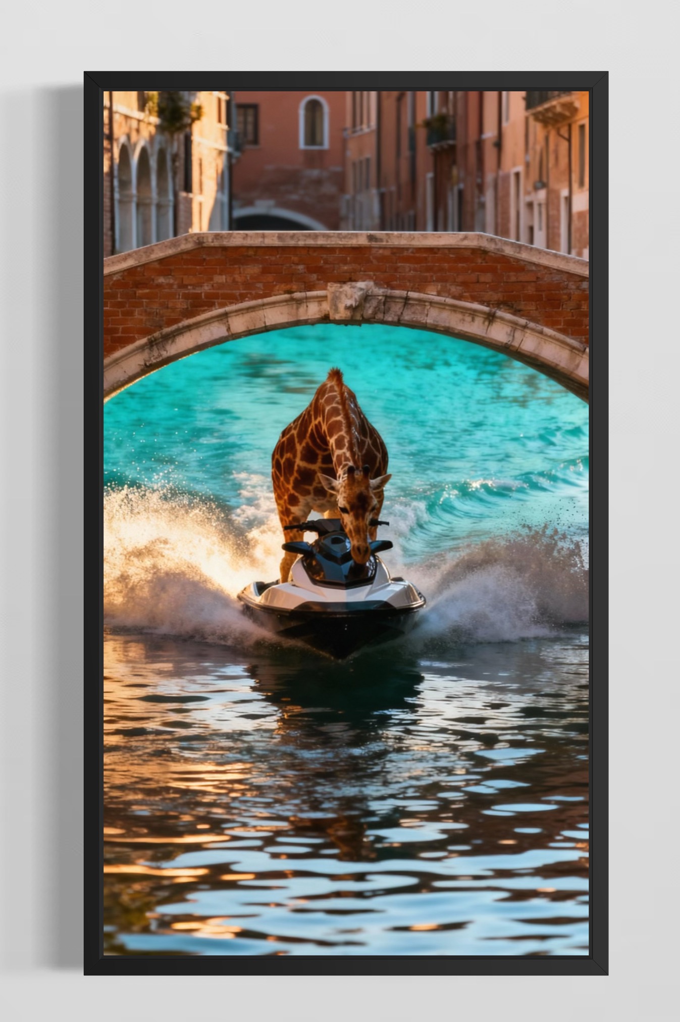 En helt orimlig men underbart rolig scen: en giraff som gasar fram på vattenskoter genom en historisk kanalstad. Tegelbroar, fasader och kvällsljus blandas med vattenstänk och lång hals. En perfekt poster för hall, vardagsrum, tonårsrum eller kontor som behöver mer fantasi och mindre allvar.