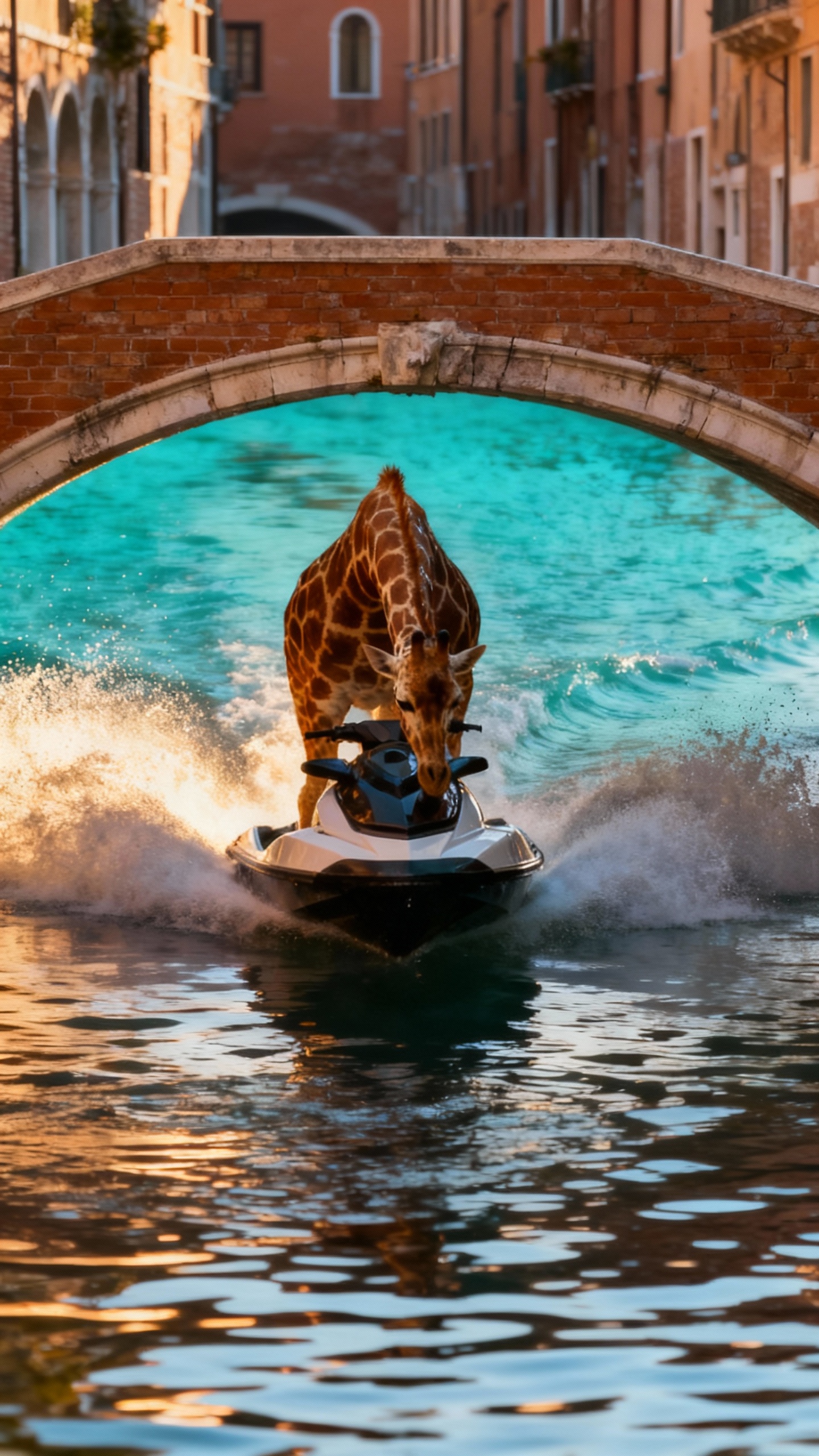 Fotorealistisk giraff som kör vattenskoter i full fart genom en smal europeisk kanal, under en tegelbro, vattenstänk och varmt kvällsljus, ingen text
