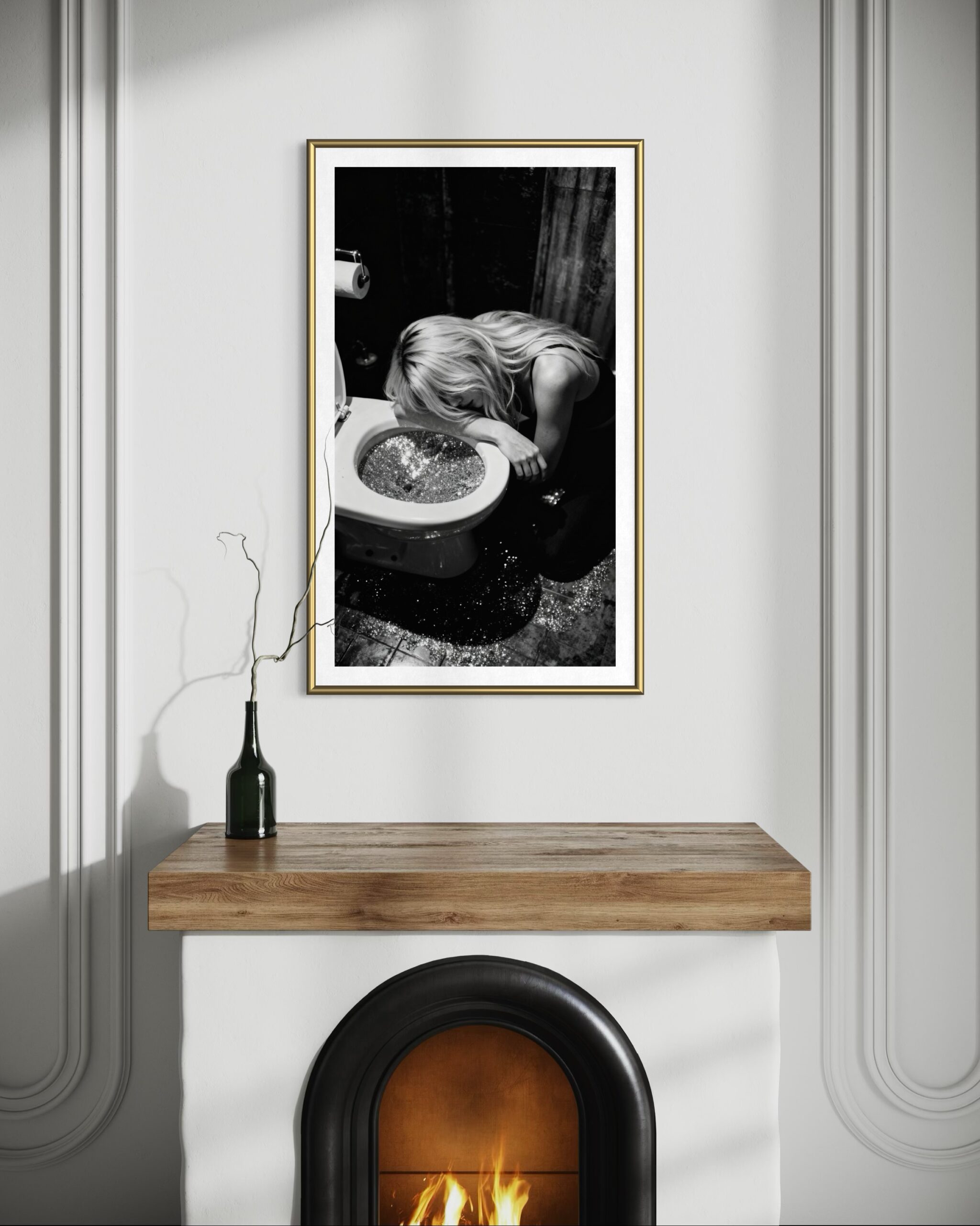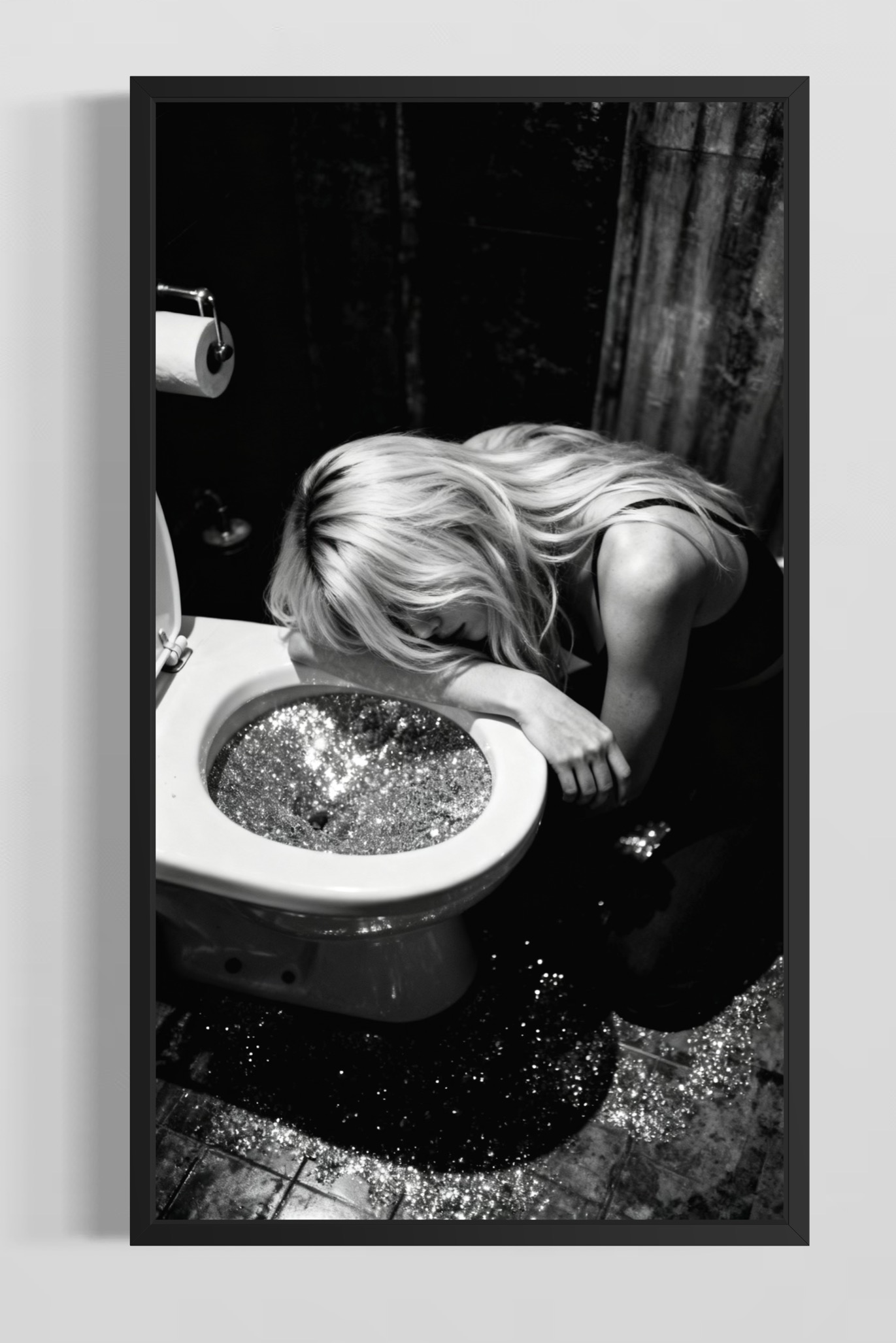 En rå men humoristisk svartvit fotoposter där gårdagens fest möter dagens verklighet. Kvinnan lutar sig trött mot toaletten, men i stället för vanligt vatten glittrar skålen av glitter och konfetti. Det hårda ljuset och den korniga känslan ger bilden en dokumentär ton med en tydlig twist – perfekt i badrum, hall, barhörna eller som oväntad detalj i vardagsrummet.
