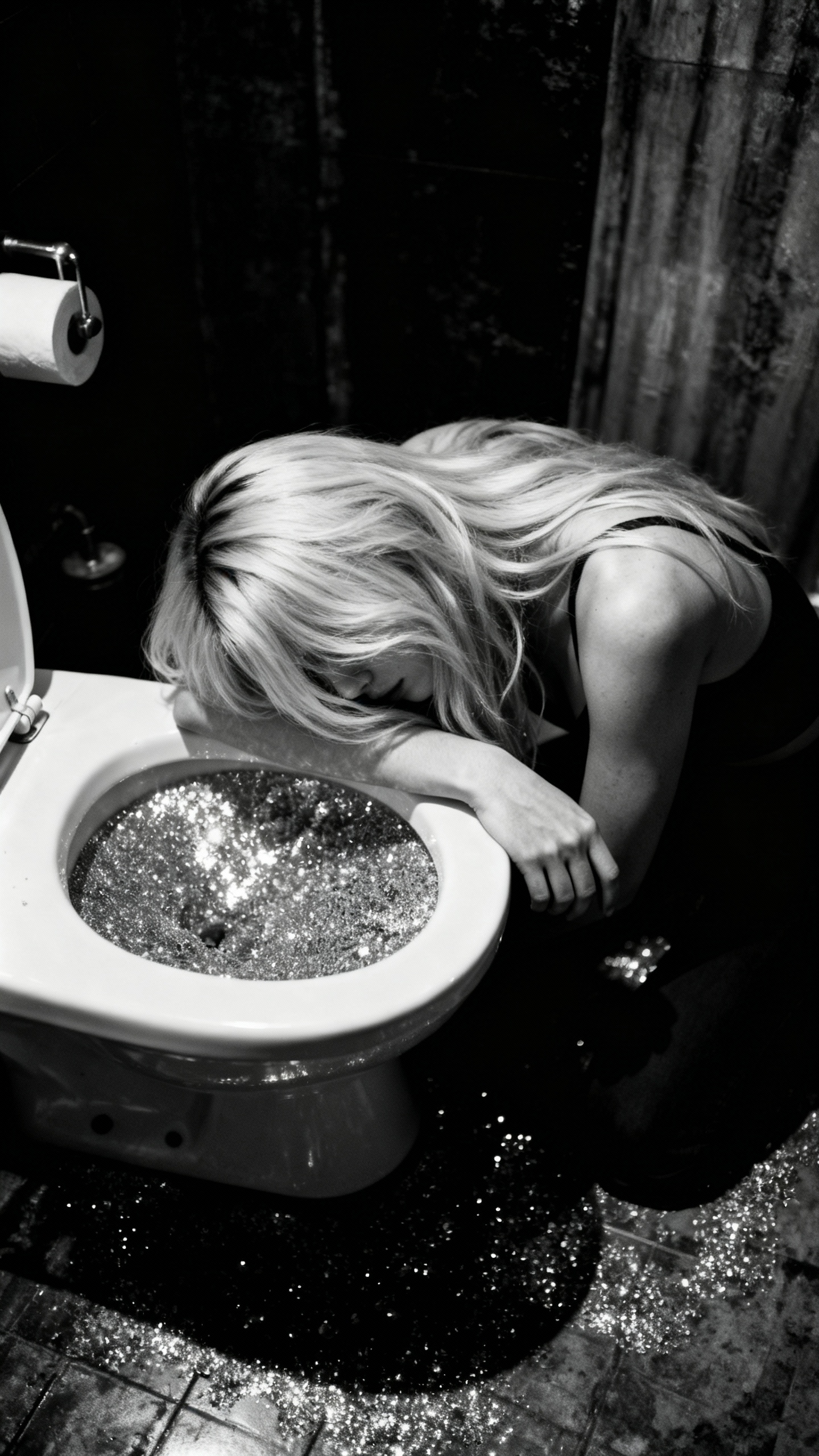 Svartvit fotoart av en kvinna som halvligger mot en toalett där vattnet glittrar av glitter och konfetti, kornig textur, hårt badrumsljus, ingen text