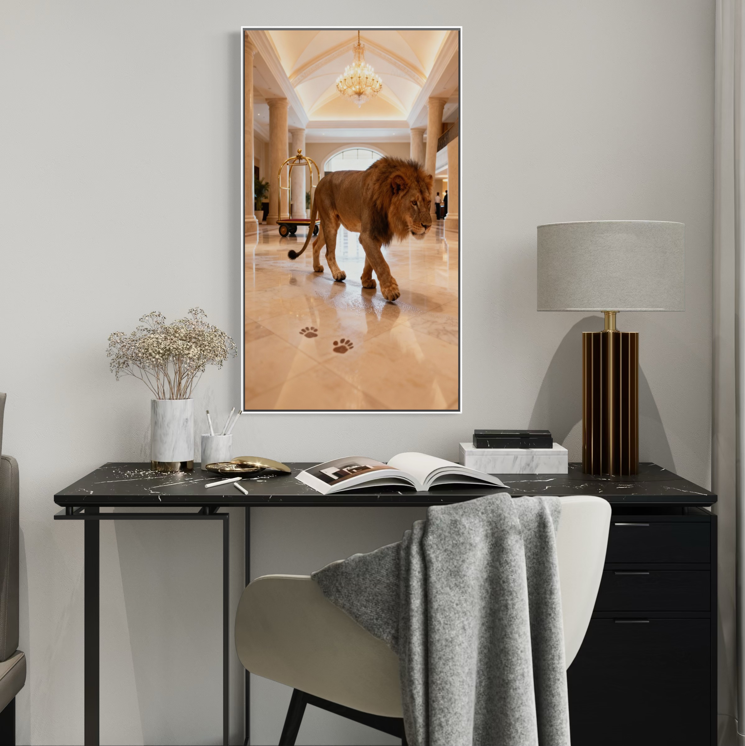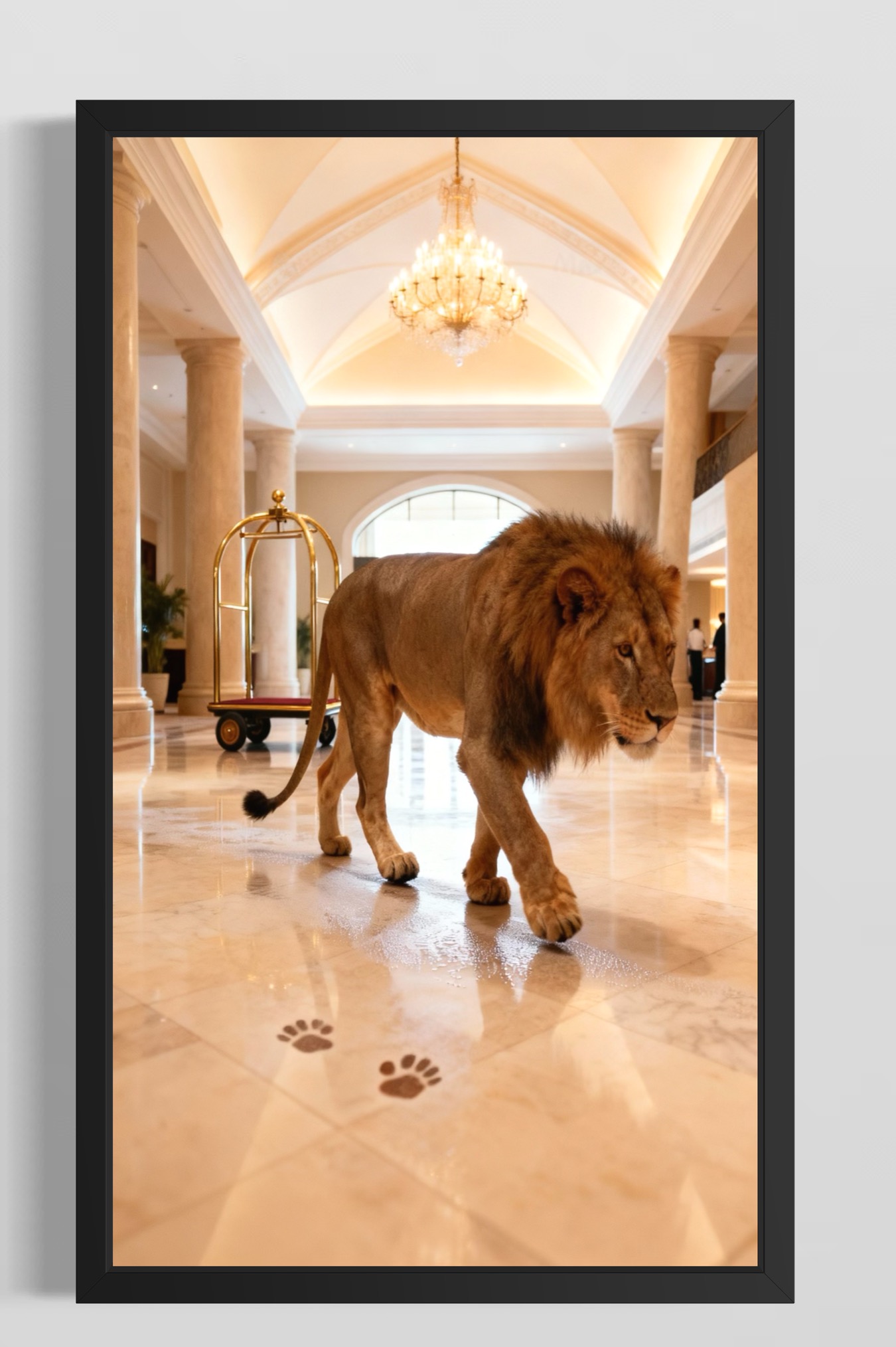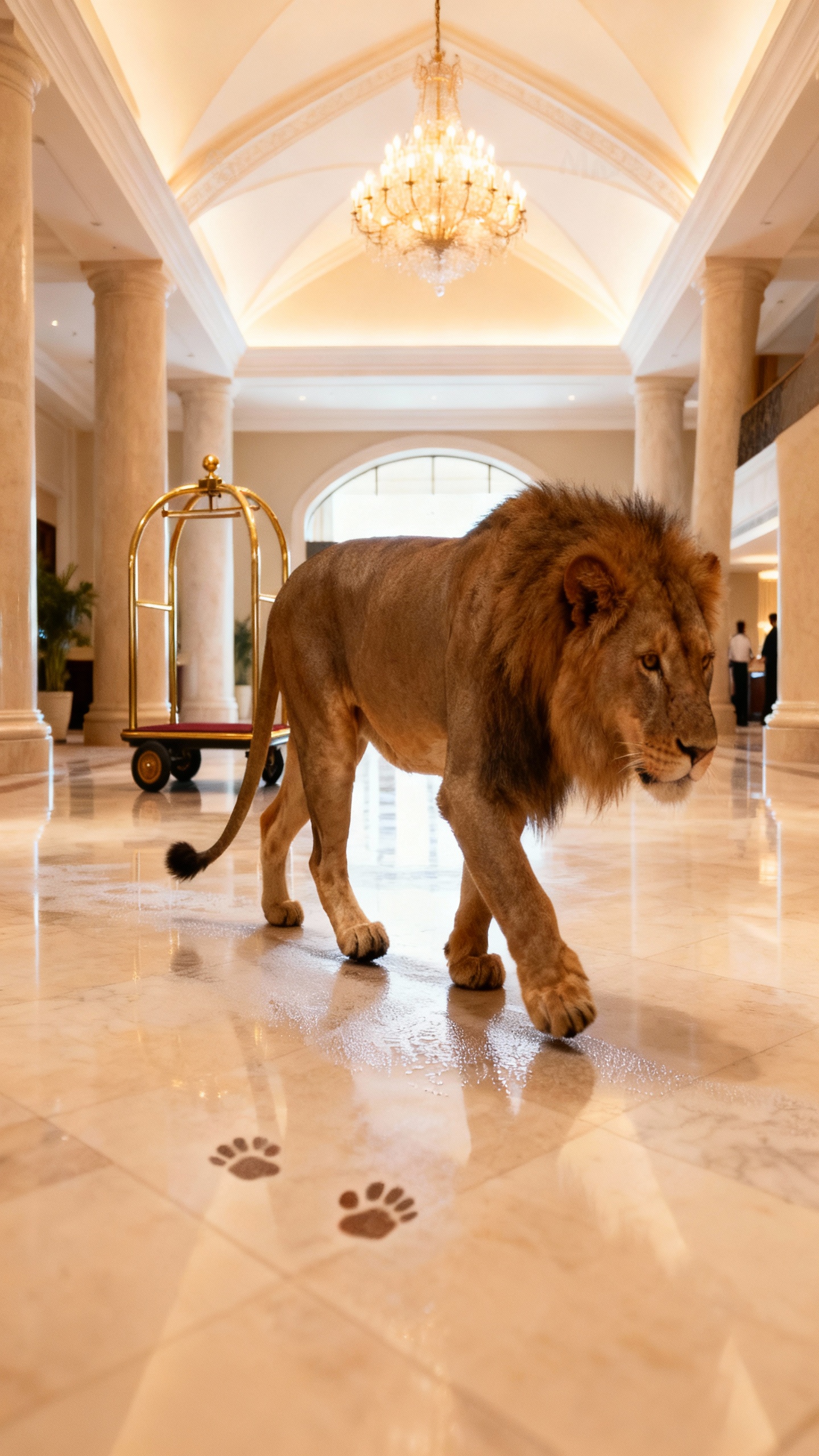 Fotorealistiskt lejon som promenerar genom en lyxig hotellobby med blankt marmorgolv, kristallkrona i taket och mjukt, varmt kvällsljus, våta tassavtryck syns bakom lejonet, ingen text, hög detaljrikedom