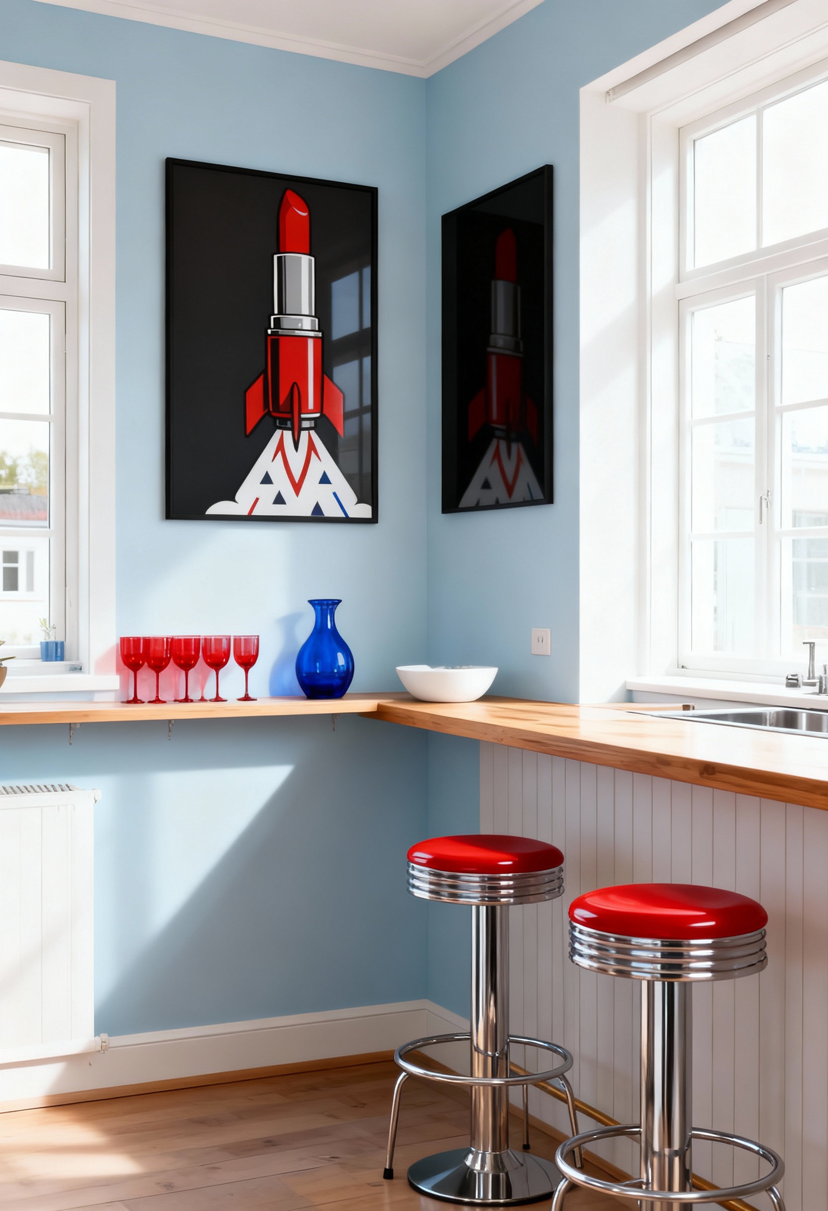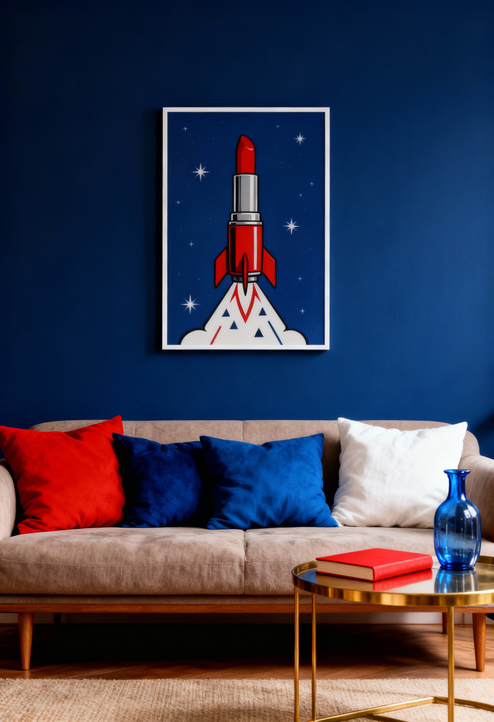 En grafisk pop art-poster där ett rött läppstift förvandlats till en raket som skjuts mot stjärnorna. Den marinblå rymdbakgrunden och de stiliserade eldflammorna skapar en dynamisk och färgstark komposition. En perfekt poster för den som älskar mode, rymd och retrofuturism.