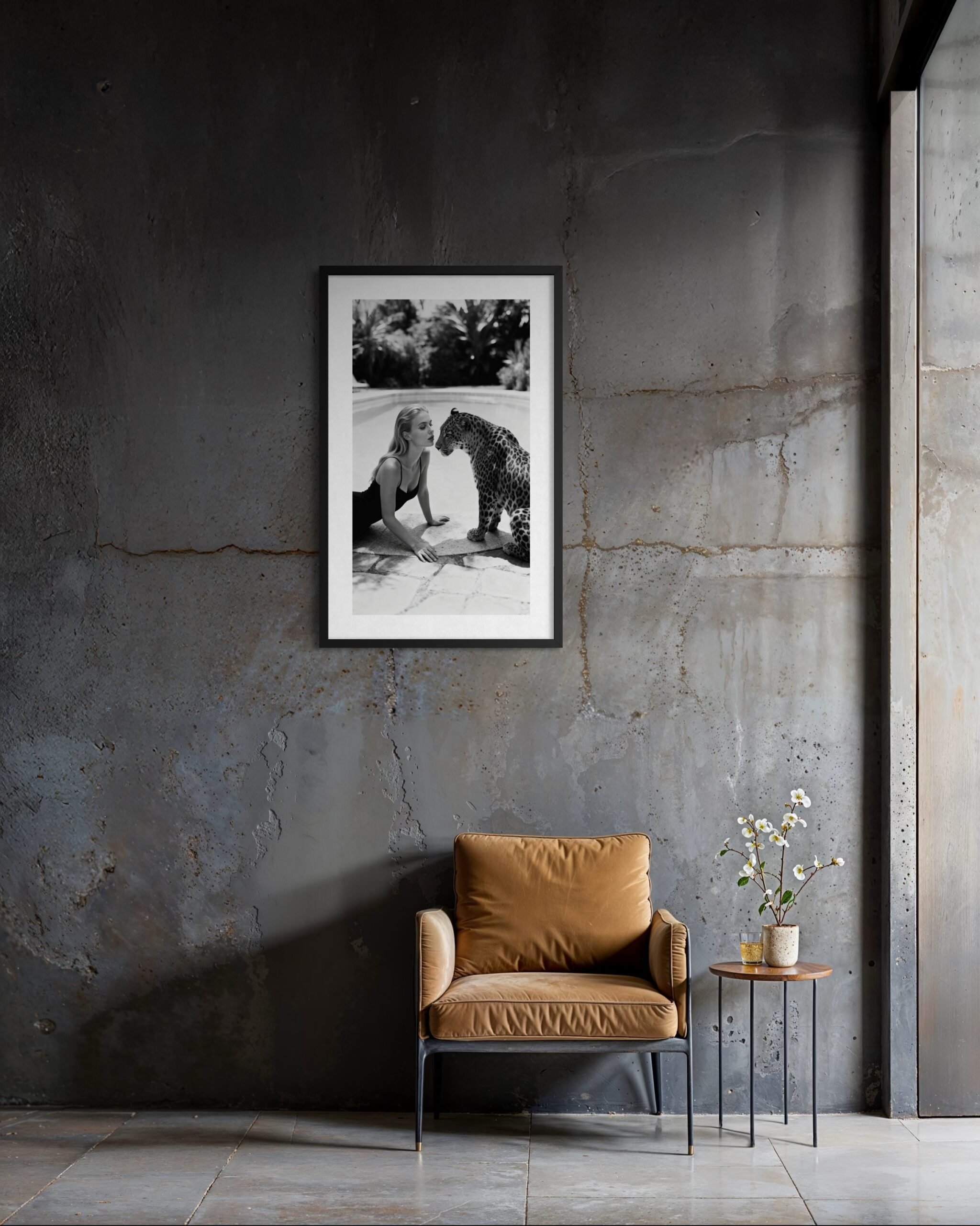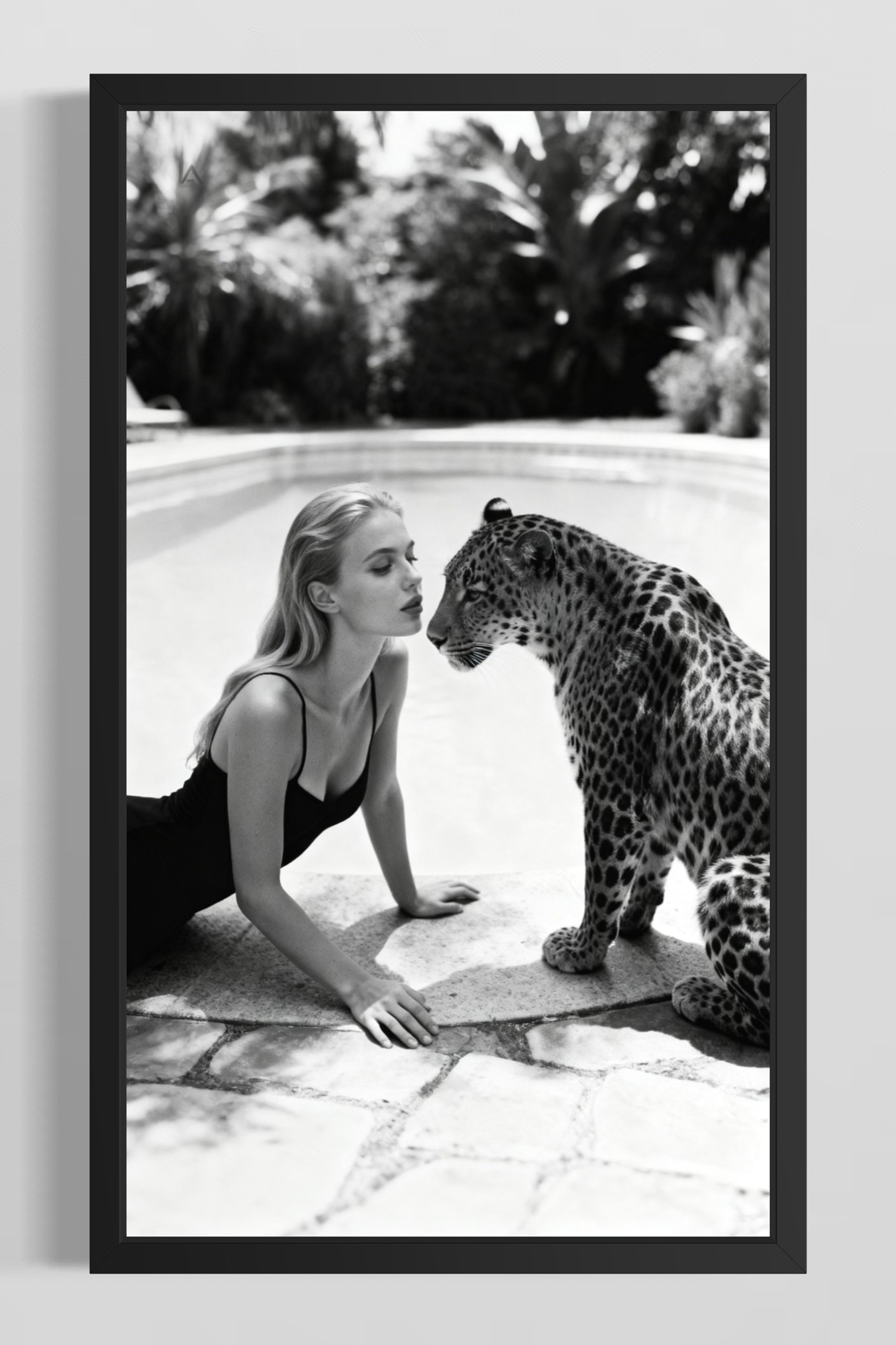 En lyxig och lite farlig fotoposter där mode möter vilda djur. Kvinnan i enkel svart baddräkt ligger avslappnat vid poolkanten medan leoparden vilar bredvid i solen. Det hårda ljuset och de skarpa skuggorna skapar en tydlig Hollywood-känsla. Ett snyggt statement i vardagsrum, sovrum, walk-in closet eller hotellmiljö.