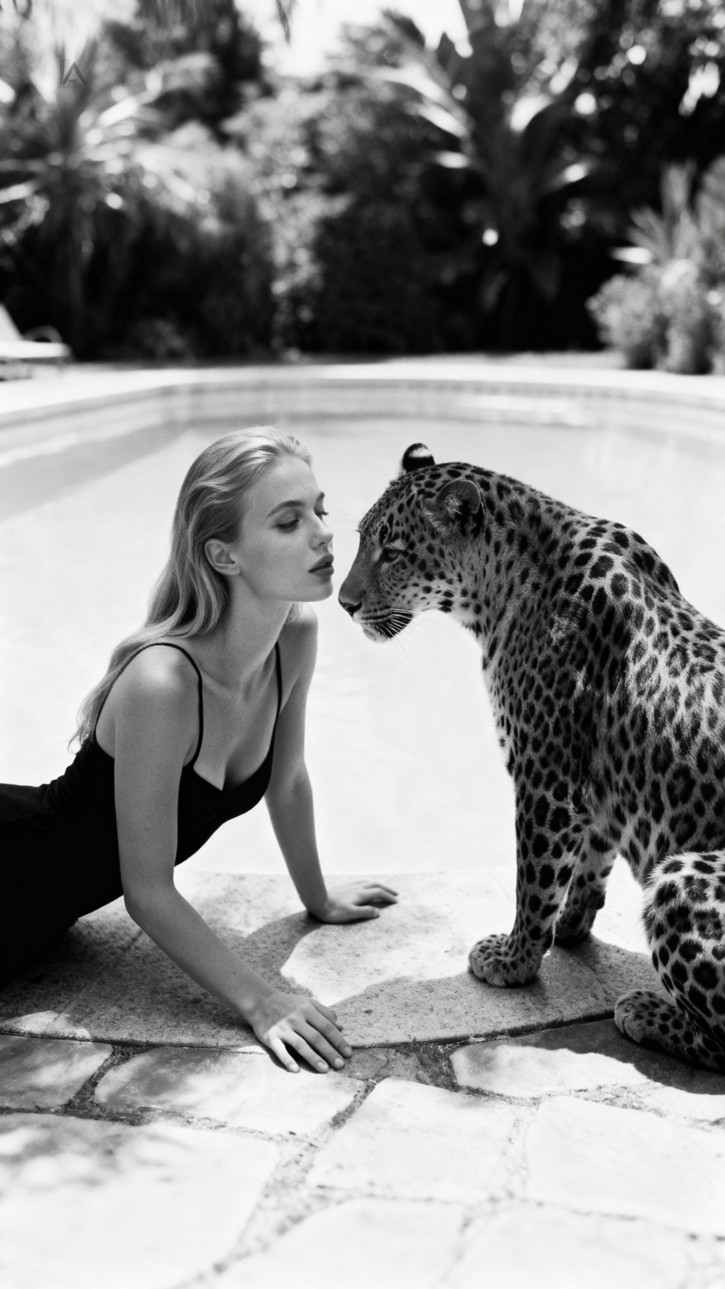 Svartvit, filmisk bild där en kvinna i svart baddräkt ligger vid en poolkant och vilar mot en leopard i solen, hårt ljus och skarpa skuggor, ingen text