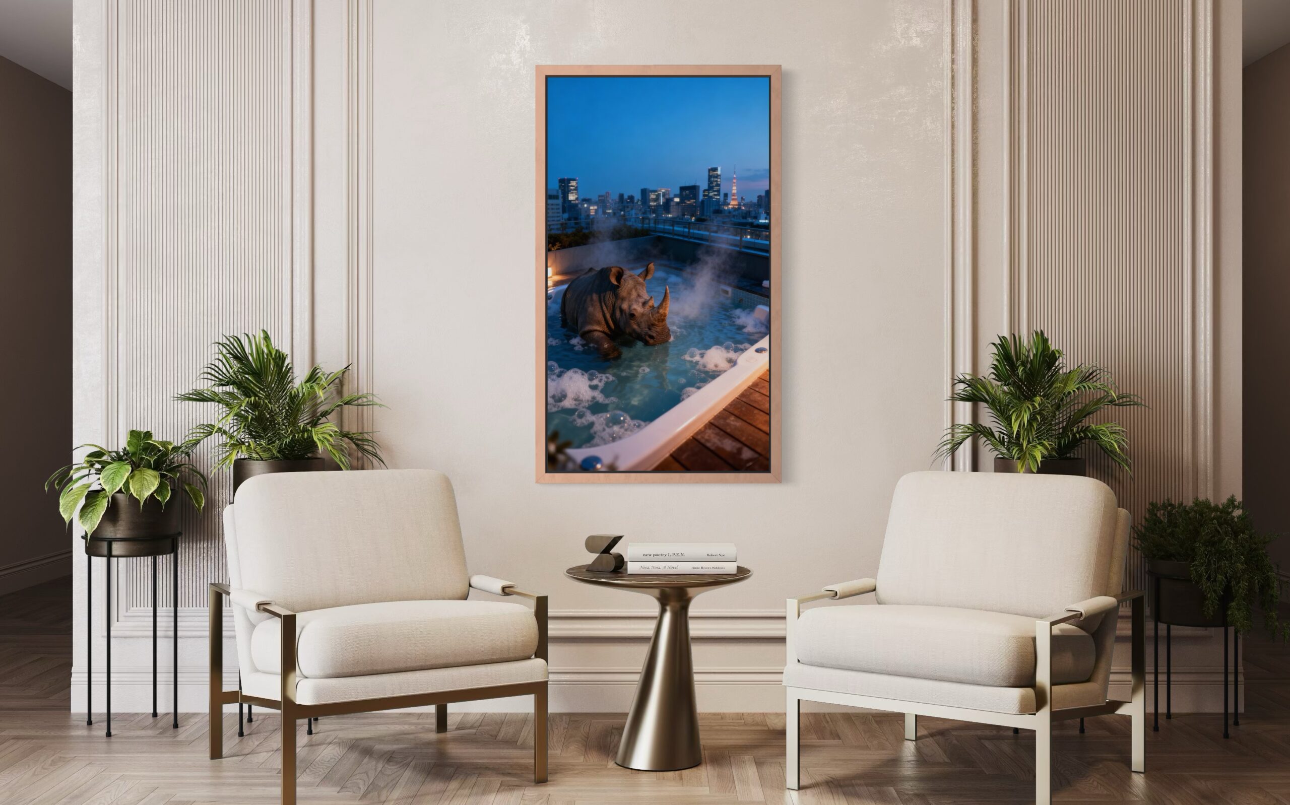 En surrealistisk poster där en noshörning njuter av ett bubblande jacuzzibad på en takterrass i Tokyo. Stadens ljus glittrar i bakgrunden medan ånga stiger från det varma vattnet. Det blåa skymningsljuset och stadens siluett skapar en drömsk kontrast mot det otippade motivet. Perfekt som statement-piece i vardagsrum eller kontor.