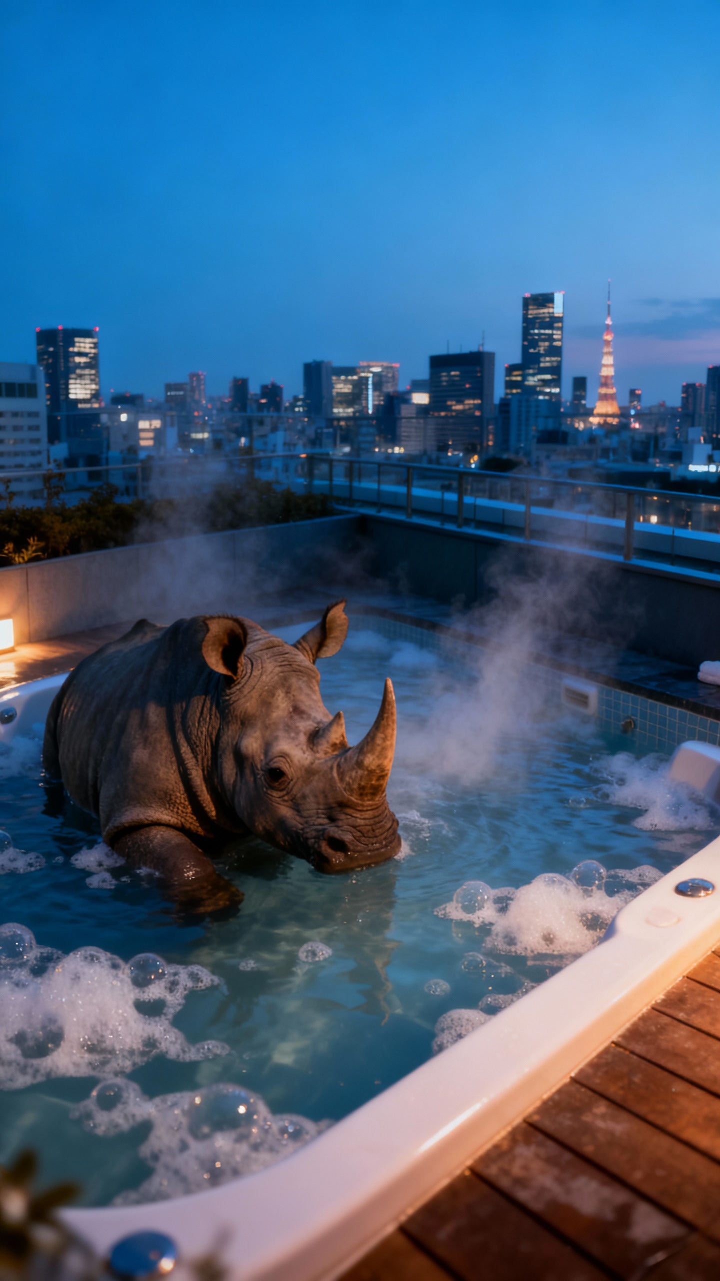 Fotorealistisk noshörning som badar i en jacuzzi på en takterrass med Tokyos skyline i bakgrunden, varmt kvällsljus, bubblande vatten, hög detaljrikedom, ingen text