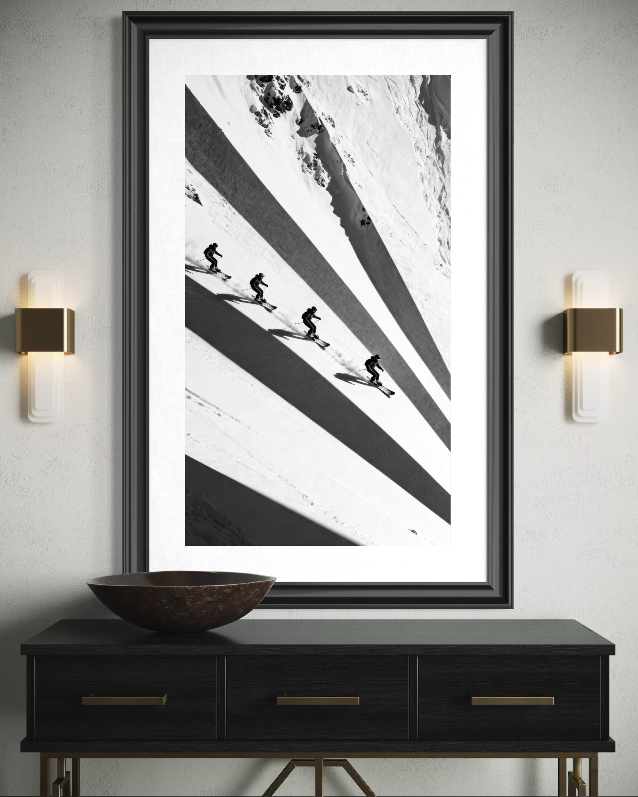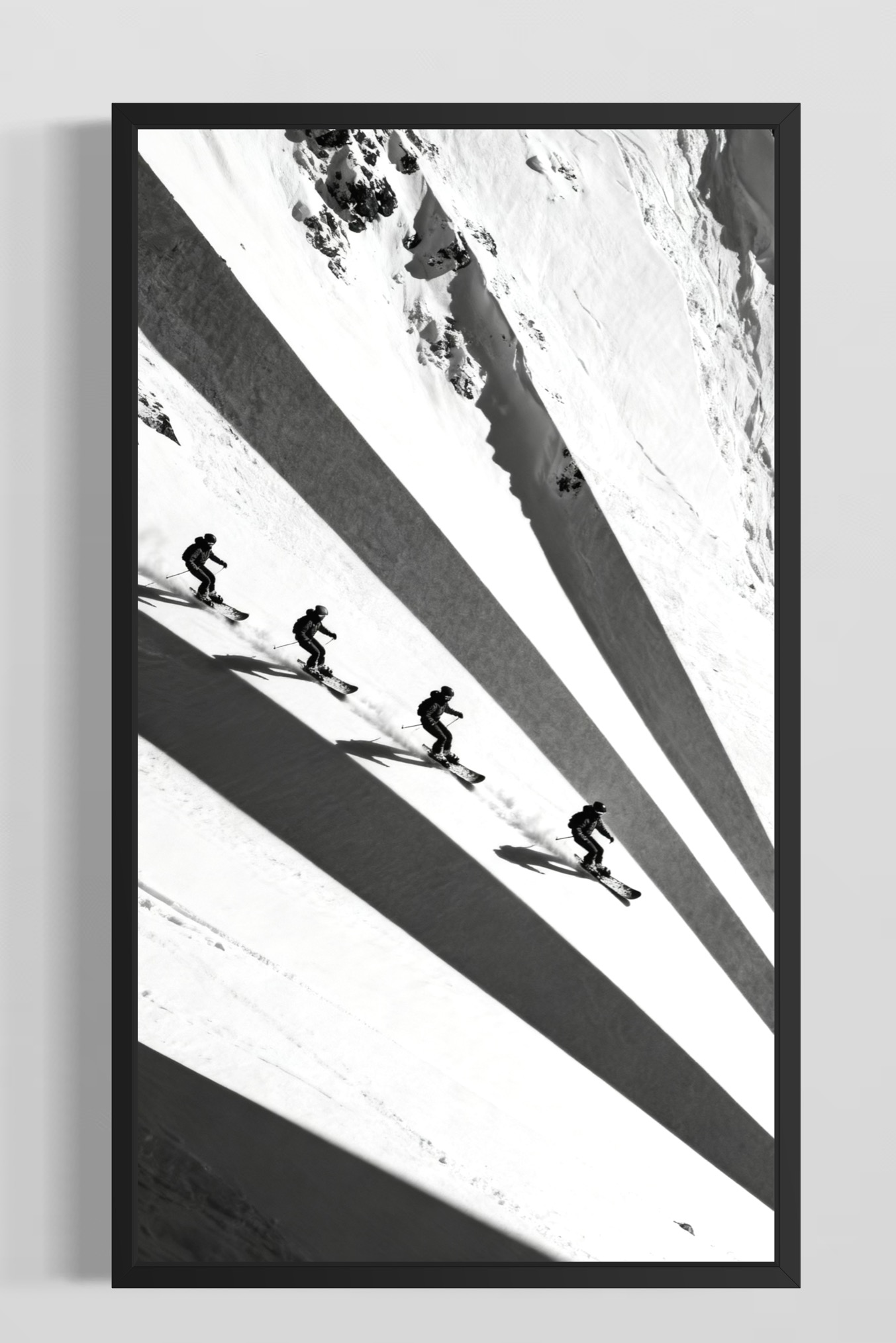 En dramatisk, nästan abstrakt skidbild där de långa skuggorna blir lika viktiga som själva åkarna. Det hårda ljuset och den rena kompositionen gör postern till en perfekt väggbild i moderna hem, fjällstugor eller kontor som vill ha en diskret men kraftfull referens till skidåkning.