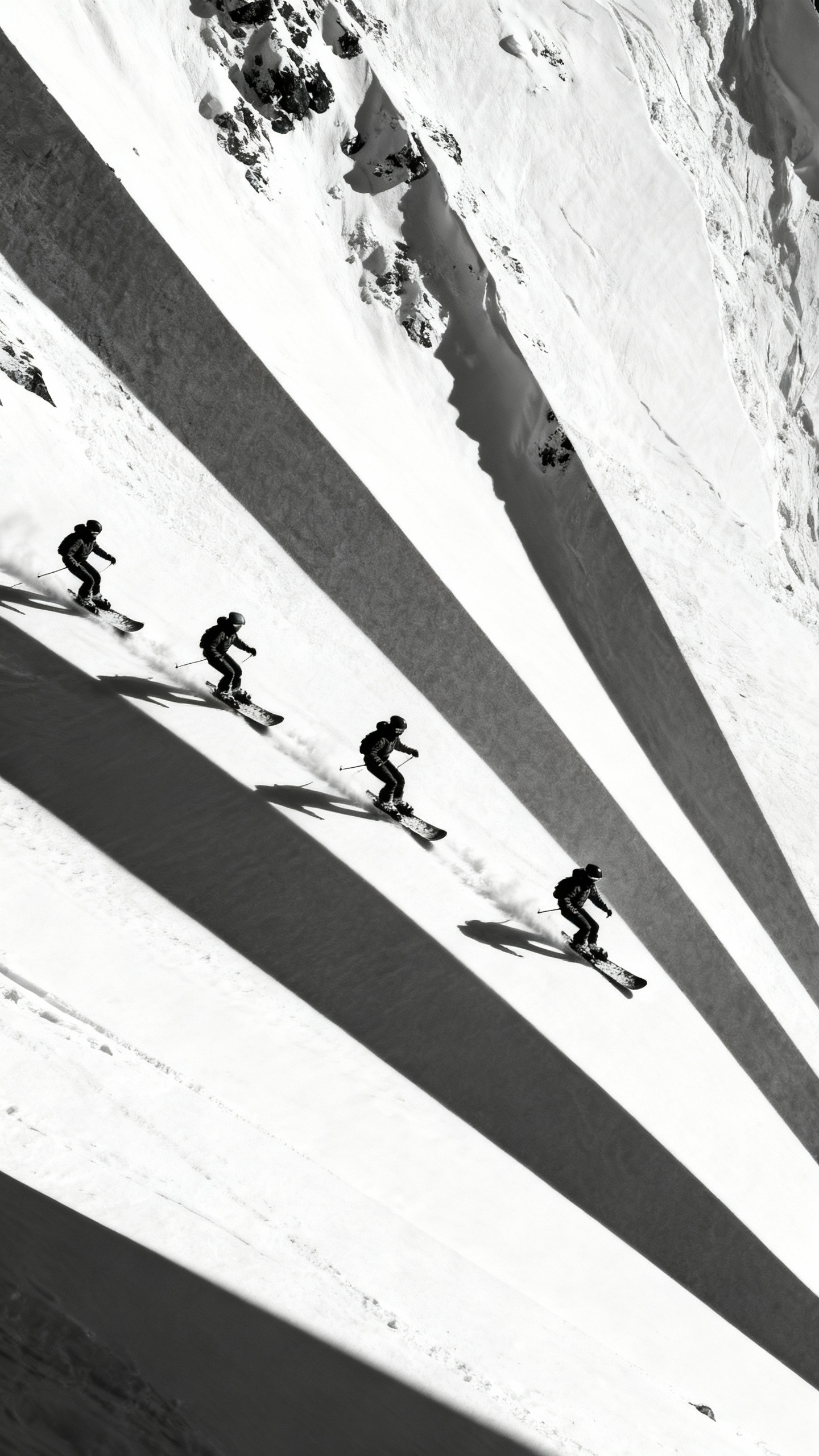 Svartvit grafisk bild av flera skidåkare som korsar en brant snösluttning med långa diagonala skuggor, hård kontrast, ingen text